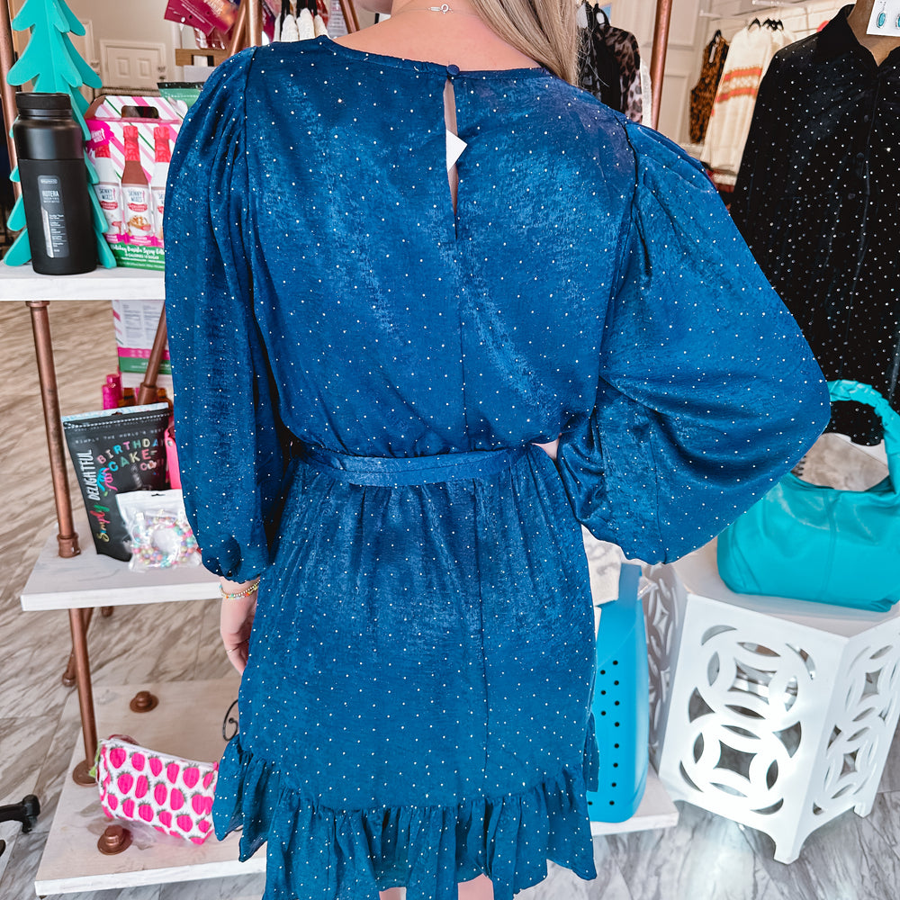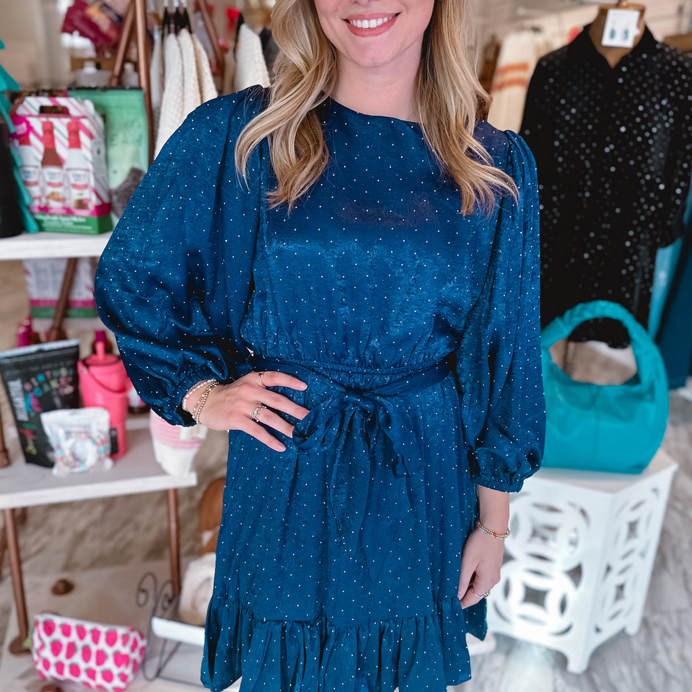 Slip into elegance with this stunning deep navy satin dress that's ready to turn heads! Featuring a luxe satin material that drapes beautifully, this long-sleeve stunner comes with a removable self-tie belt to cinch your waist just right. The rhinestone-dotted details add a touch of sparkle and sophistication, making it perfect for date nights or special occasions. True to size and oh-so-flattering, this midnight beauty is your new go-to for effortless glamour.