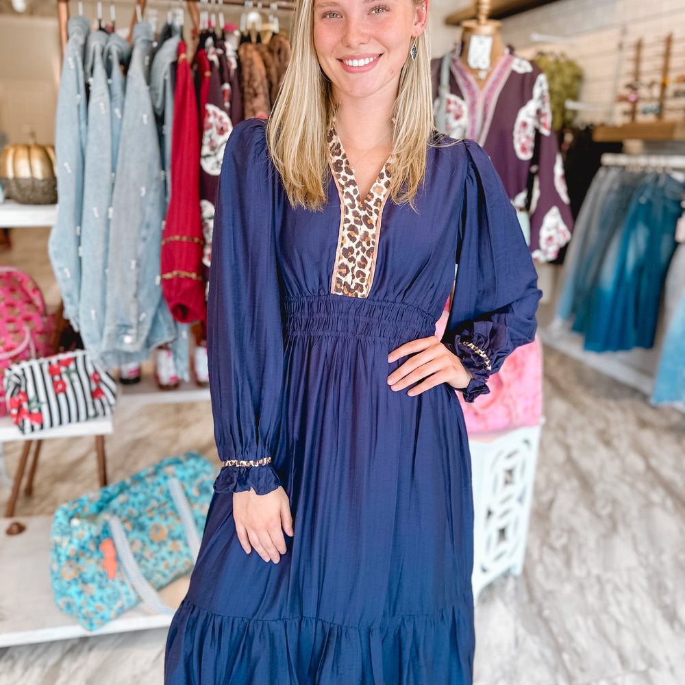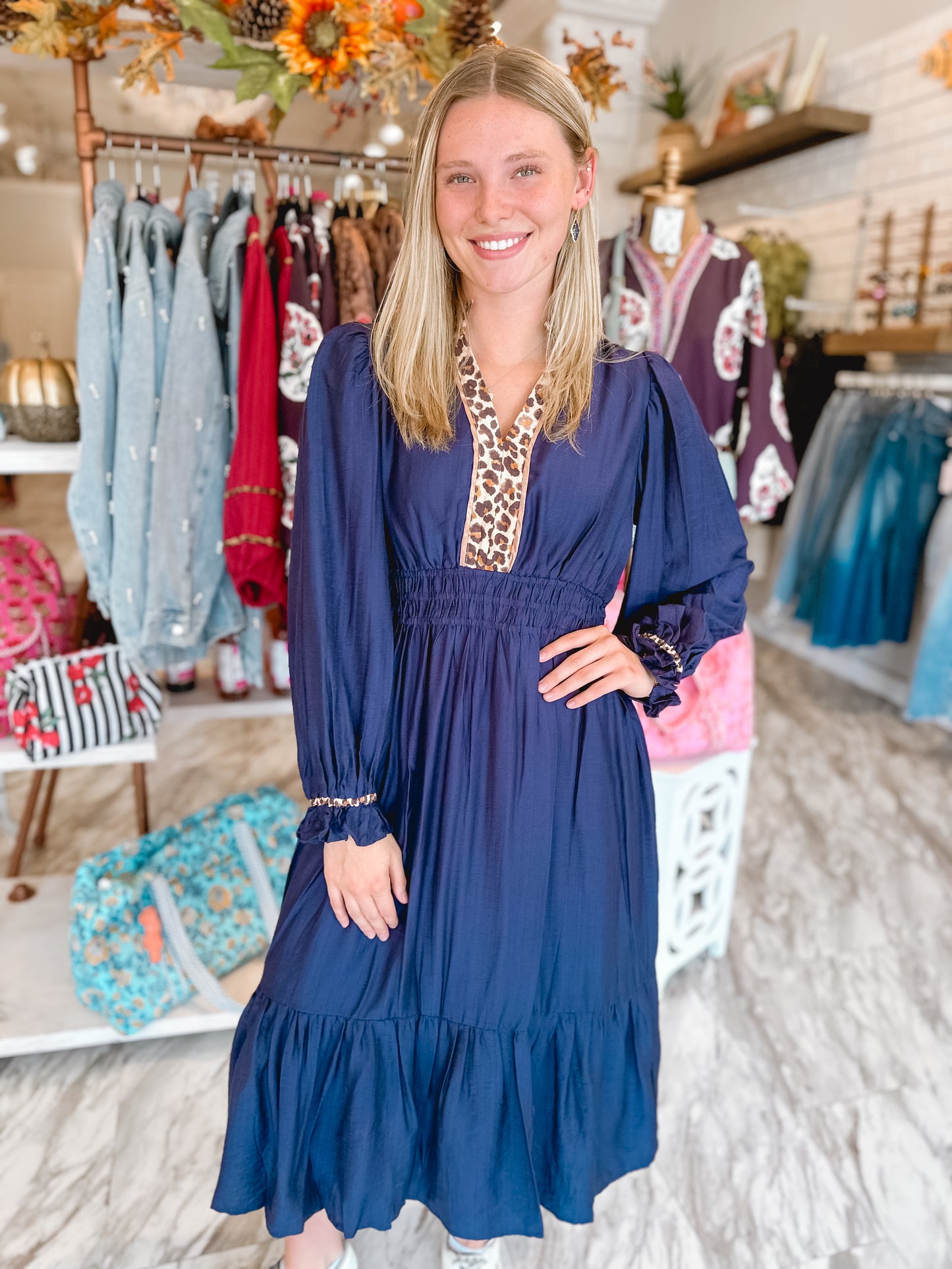 Tahoe Weekend Navy Leopard Trim Midi Dress