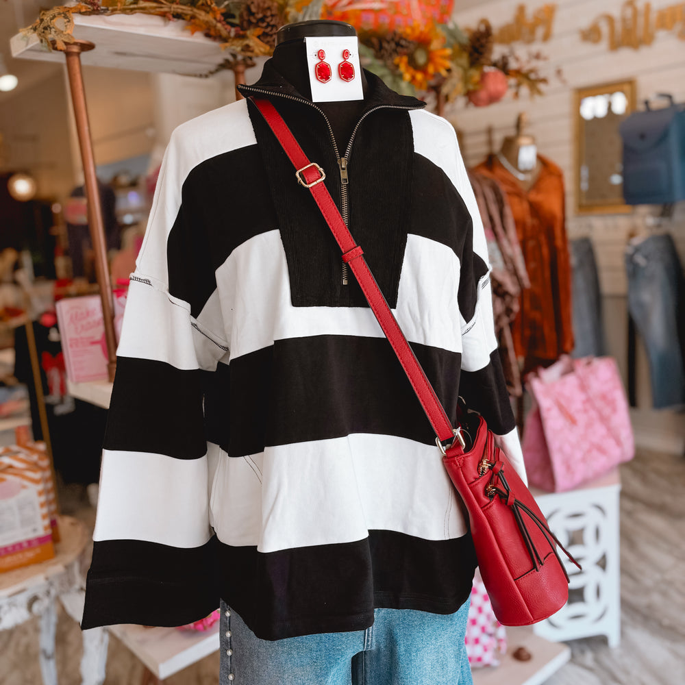 Get cozy in this playful Stadium Glam Stripe Pullover! Featuring a relaxed fit with bold black and white stripes, it’s perfect for lounging or casual outings. The half zip and mock collar add sporty flair, while wide, long sleeves bring extra comfort and laid-back style. Easy to throw on and impossible to resist!