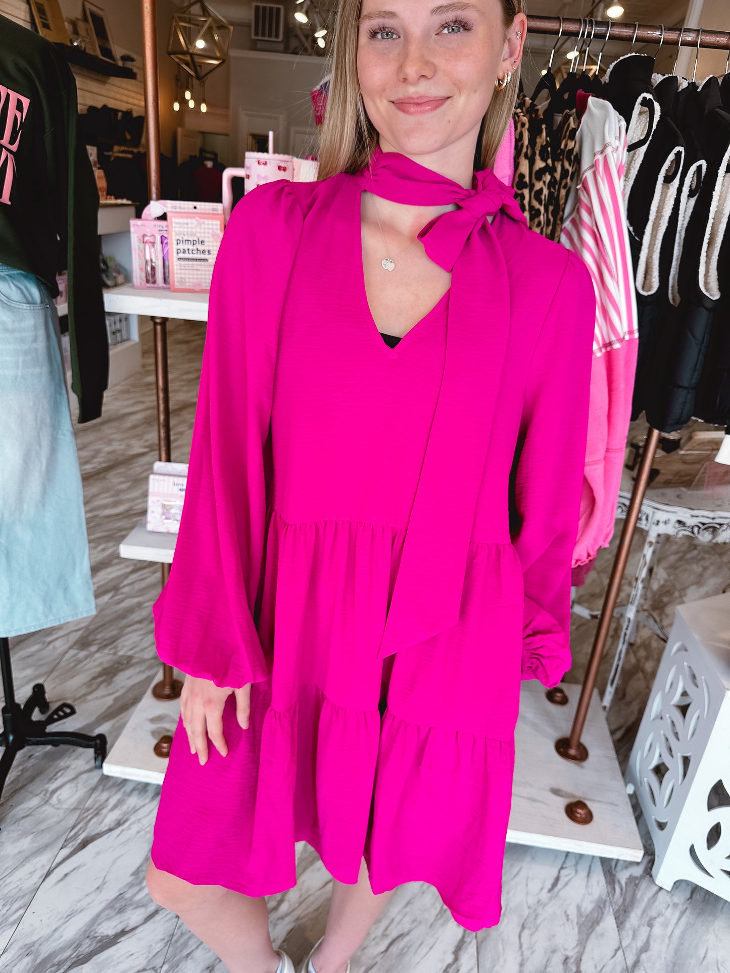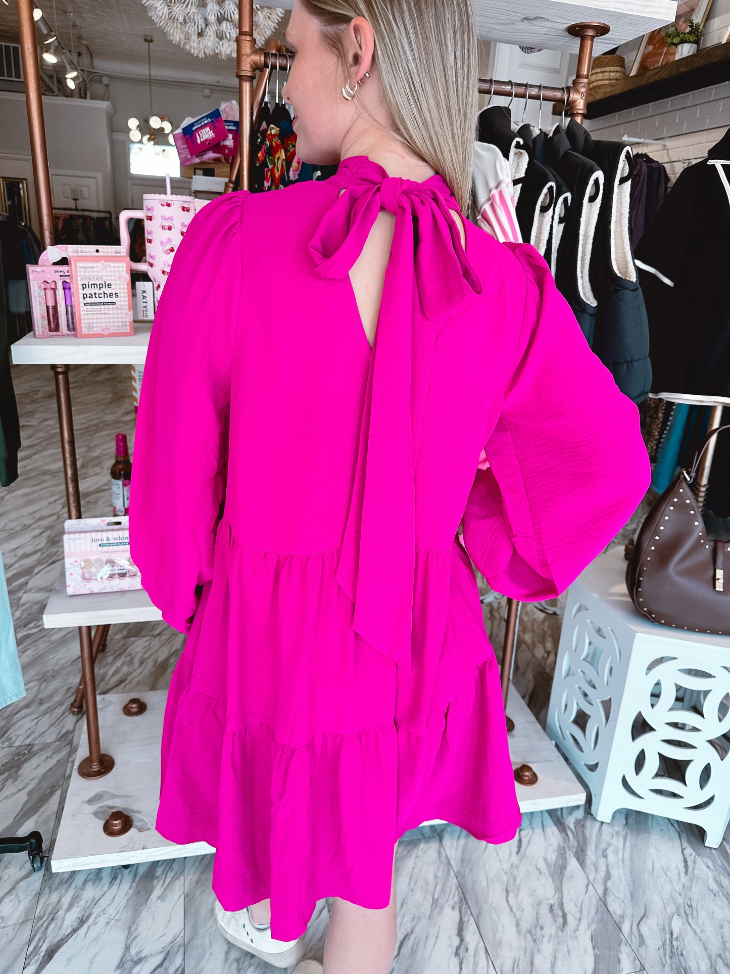 Twirl into any occasion in this charming magenta pink dress that's equal parts fun and fabulous. The relaxed fit keeps you comfortable all day long, while the mock neck and self-tie bow detail add a touch of personality to your look. Tiered layers create beautiful movement and dimension, and long sleeves offer versatile coverage.