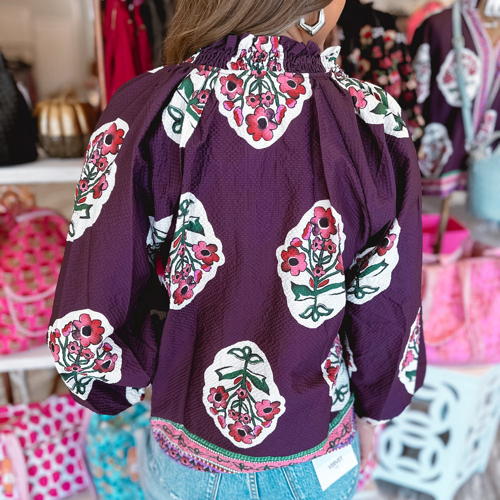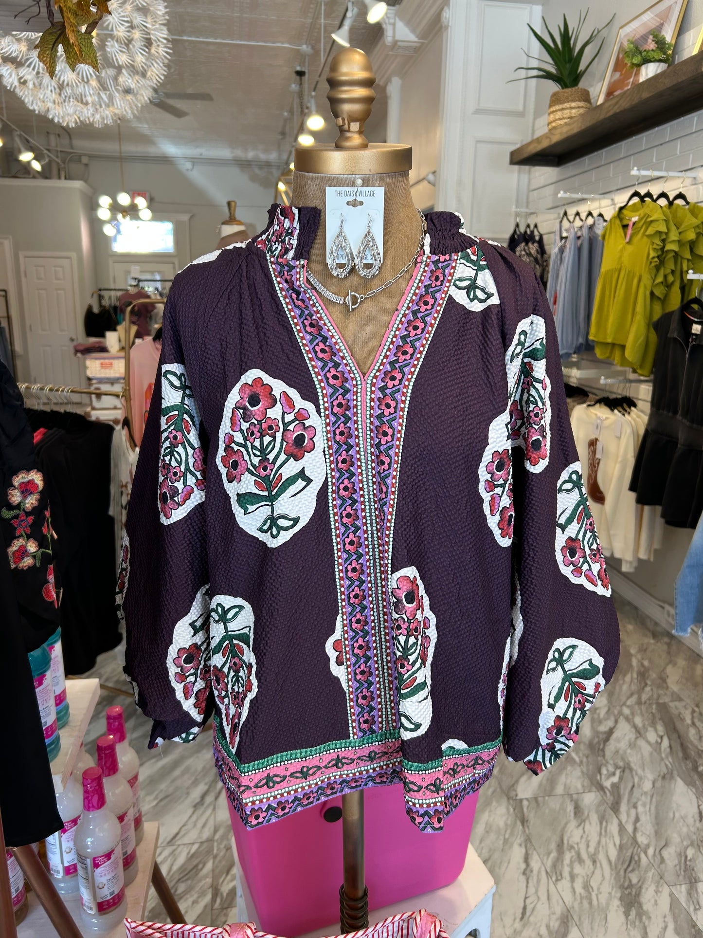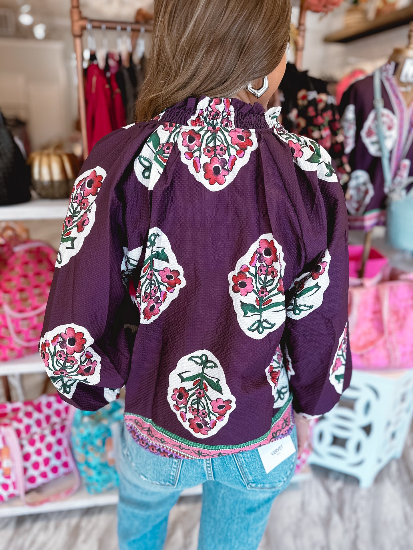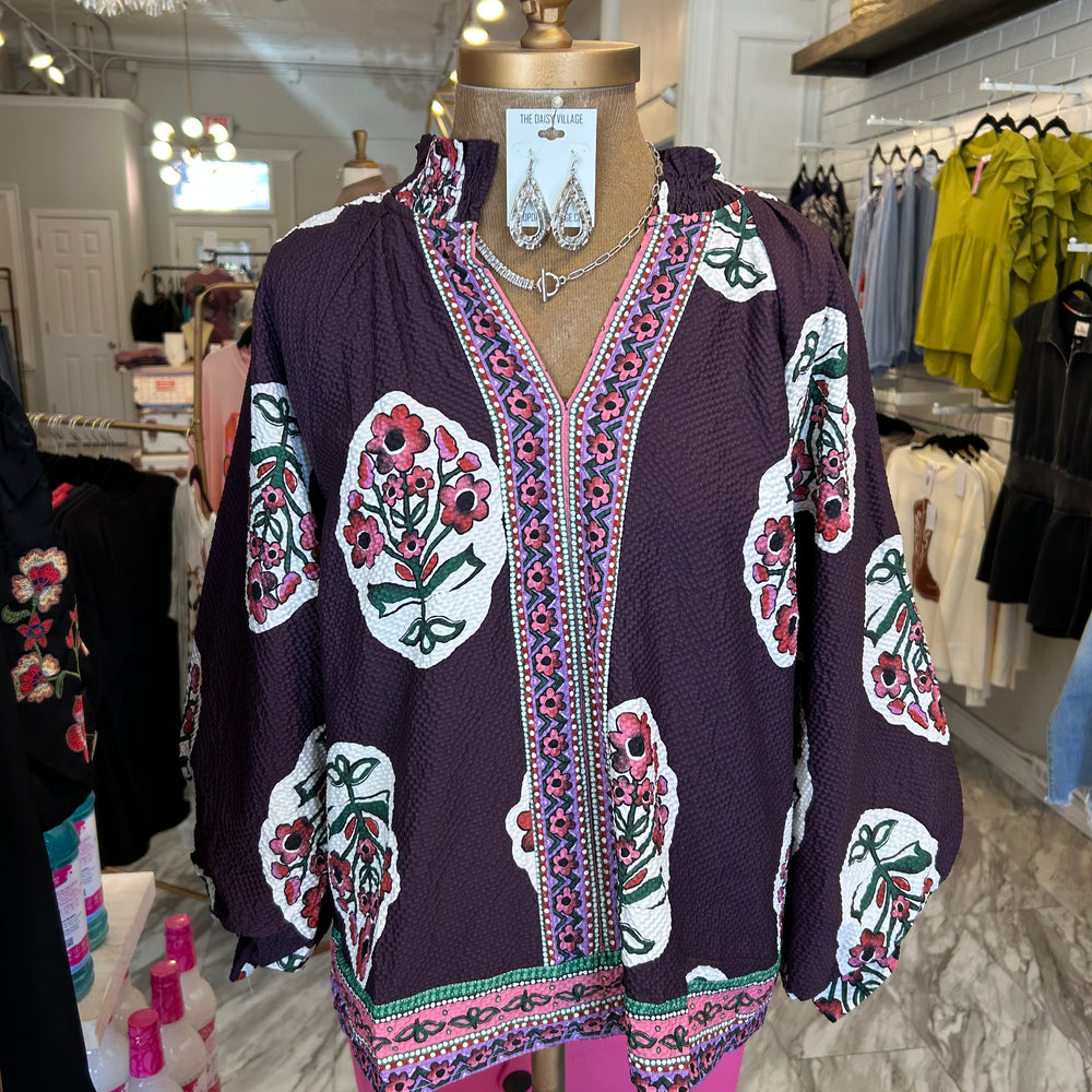 Embrace effortless charm with the Sandplum Boho Floral Top. Its relaxed fit and playful plum floral details add a touch of whimsy, while the contrast hem and placket keep things interesting. The V-neck collar and long balloon sleeves create a breezy, carefree vibe perfect for any casual day out.