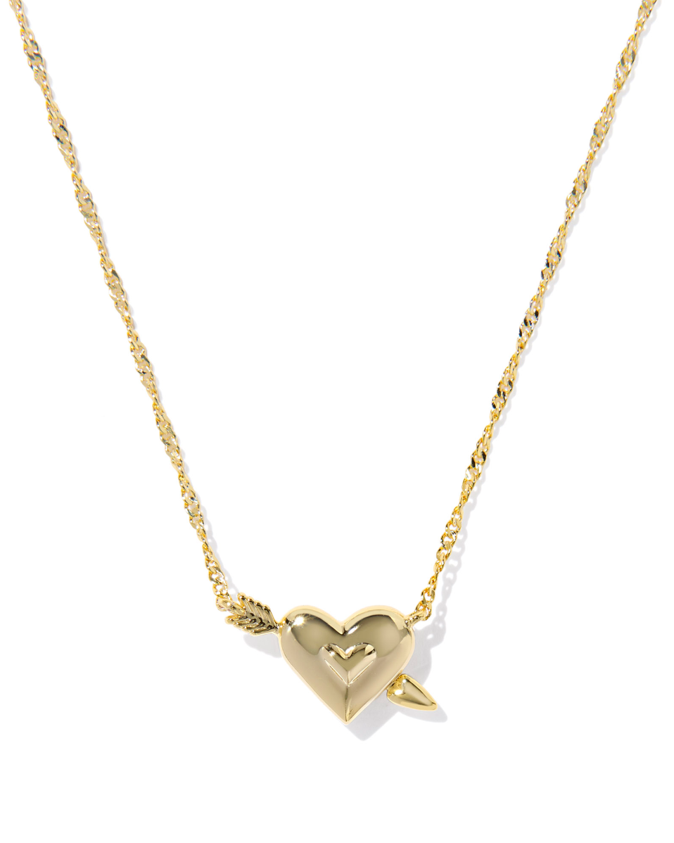 Our sweetest style gets a romantic makeover in the Ari Heart Arrow Short Pendant Necklace. Set on a dainty chain, this darling pendant features an organic heart shape and dimensional arrow design, framed with our signature hoofprint detailing. Wear it with the Ari Heart Arrow Huggie Earrings for an oh-so-cute look.