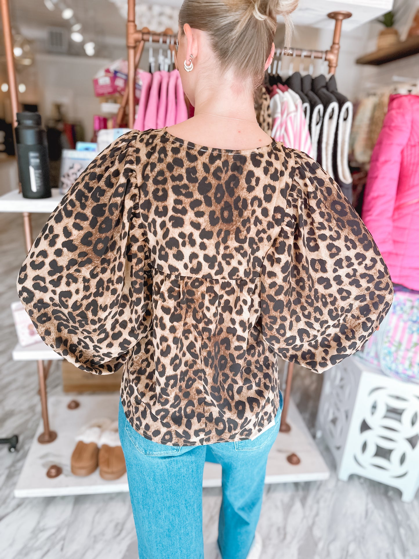 Unleash your wild side with this playful leopard print top that's equal parts fierce and fun. The relaxed fit keeps you comfortable all day, while the charming bow tie detail at the neckline adds a touch of flirty sophistication. Long puff sleeves bring that effortless, statement-making vibe to any outfit. Perfect for anyone who loves bold prints and isn't afraid to show their personality.