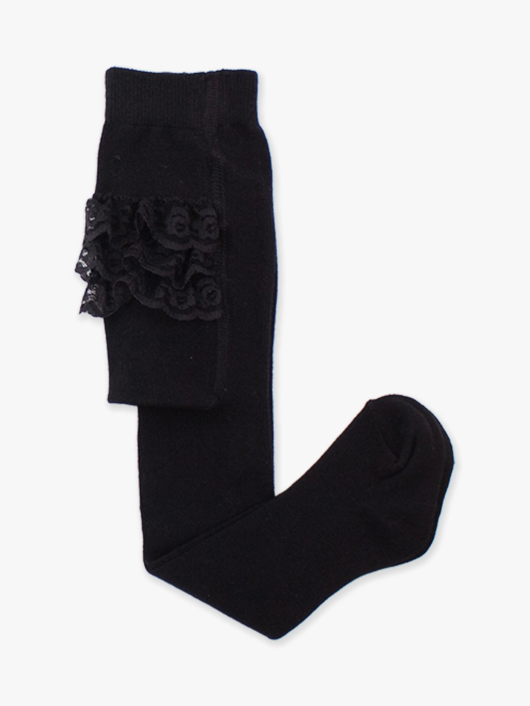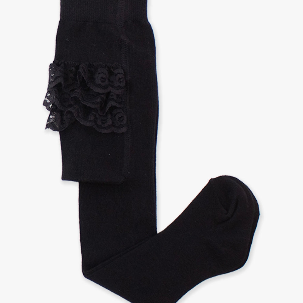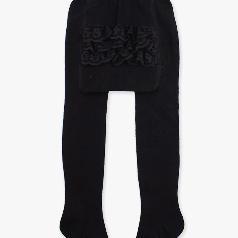 These soft knit tights offer full coverage, perfect for chilly weather. Featuring our sweet signature rear ruffles, these tights are great for layering under dresses and skirts! The simple black color makes it easy to coordinate and create a beautiful outfit. Care Instructions: Machine wash cold; only non-chlorine bleach when needed; tumble dry low or lay flat to dry.