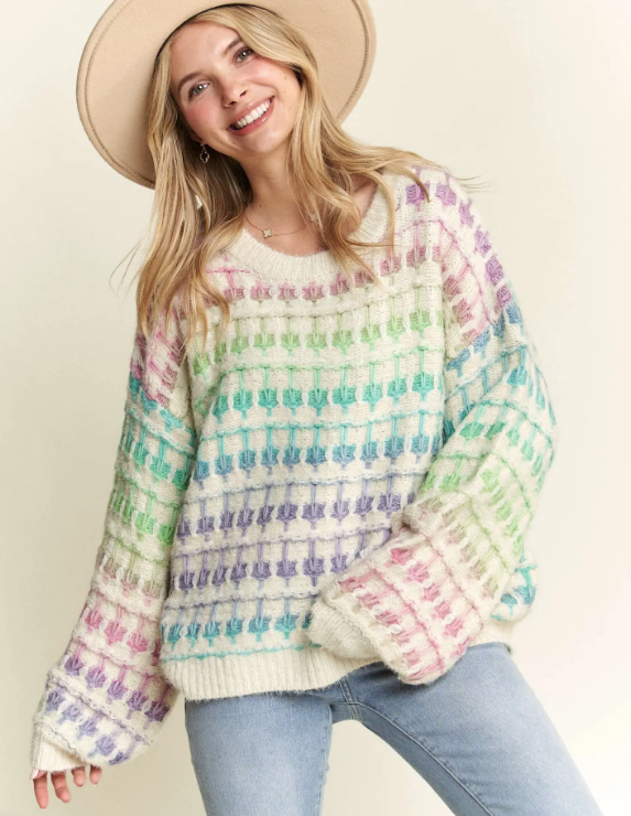 Get ready to turn heads in this Watercolor Delight Chunky Soft Knit Sweater—where comfort meets pure fun. The relaxed silhouette lets you move freely while the eye-catching colorful chunky knit steals the show. Puffed long sleeves bring that playful edge, and the boat neckline keeps it effortlessly cool. Soft enough to live in, bold enough to make a statement. Your new favorite sweater is here.